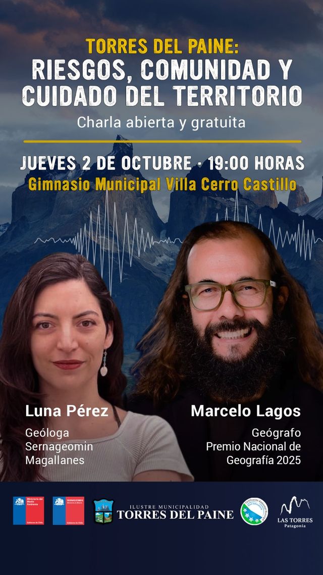 Se trata de una charla abierta y gratuita titulada “Torres del Paine: riesgos, comunidad y cuidados del territorio”, que se desarrollará el jueves 2 de octubre a las 19:00 horas en el gimnasio municipal de Villa Cerro Castillo.