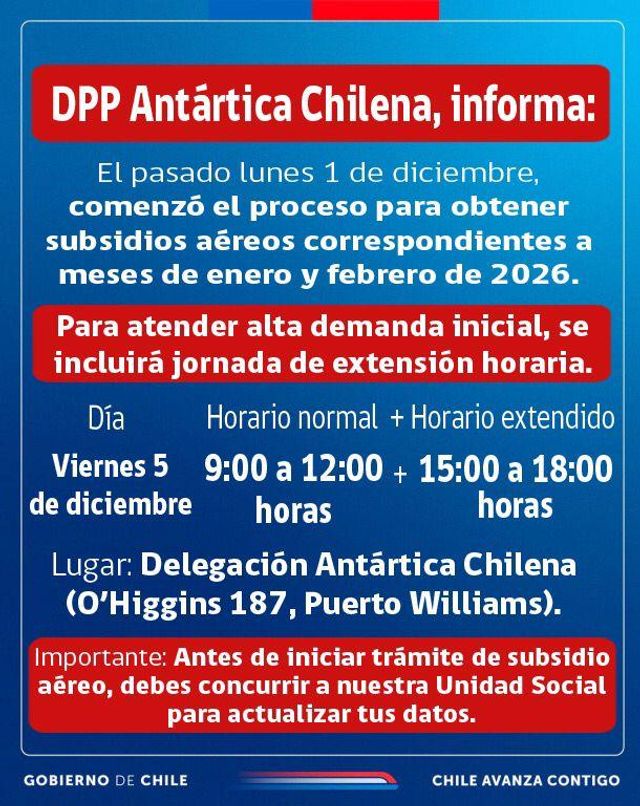 La delegada presidencial provincial de la Antártica Chilena, Constanza Calisto Gallardo, hizo un llamado a la comunidad a concurrir en los horarios establecidos y recordó que, antes de realizar el trámite en oficina de subsidio aéreo, deben actualizar sus datos personales en Unidad Social, con el propósito de actualizar el universo de residentes beneficiarios.