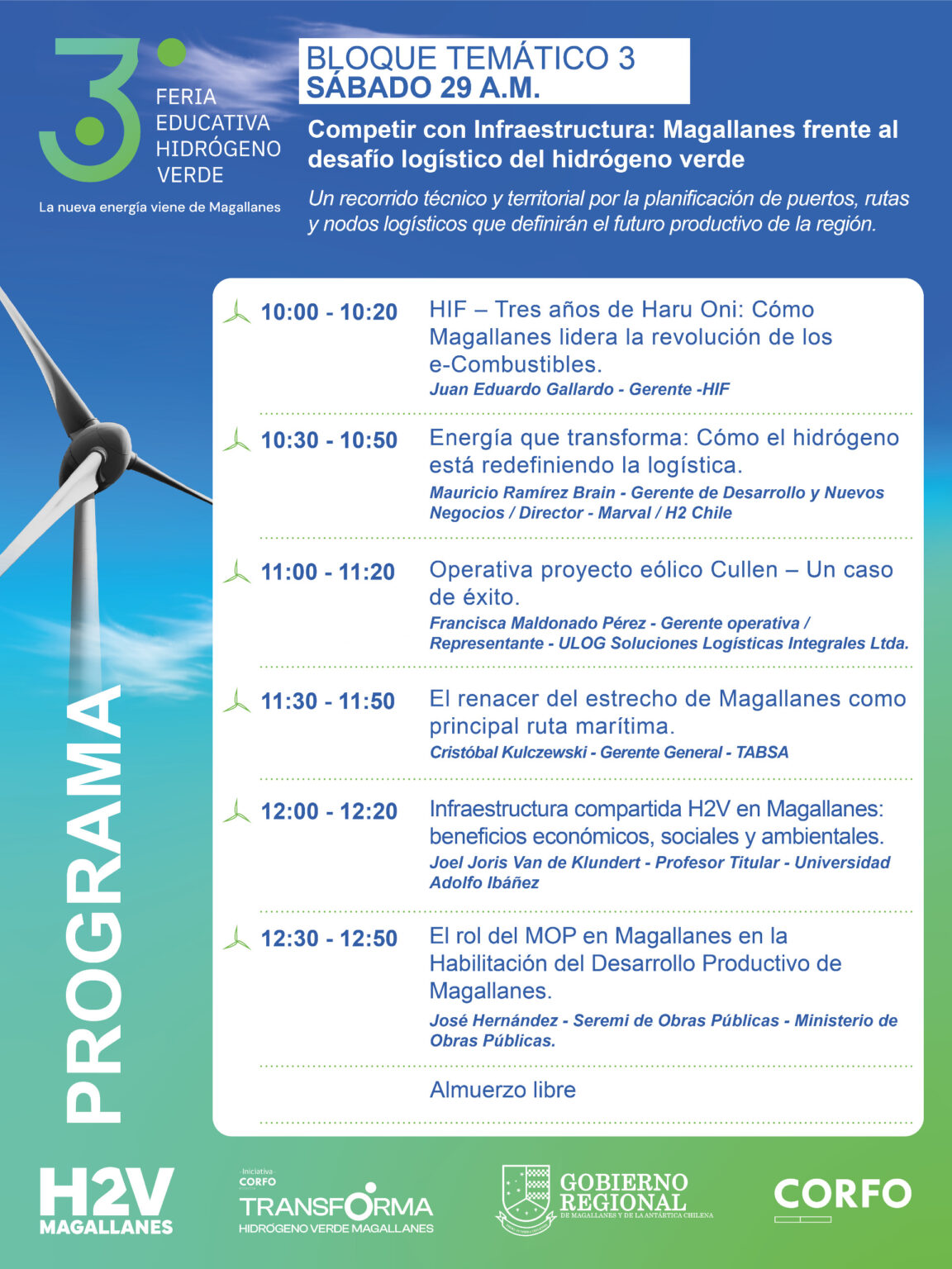 La primera de las charlas, el viernes a las 09:00 horas, es tan angular como el desarrollo mismo de este tipo de energía: “La ruta del conocimiento para el liderazgo energético de Magallanes y su desarrollo regional”, en la que participarán los rectores de la Universidad de Magallanes, Inacap, el Centro de Formación Técnica (CFT) Magallanes y de la Universidad Santo Tomás.