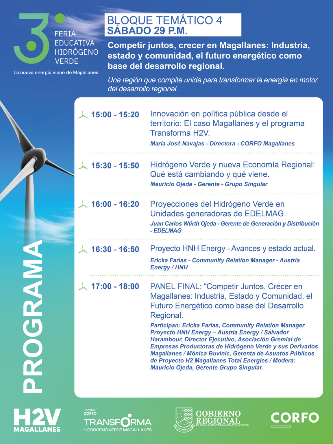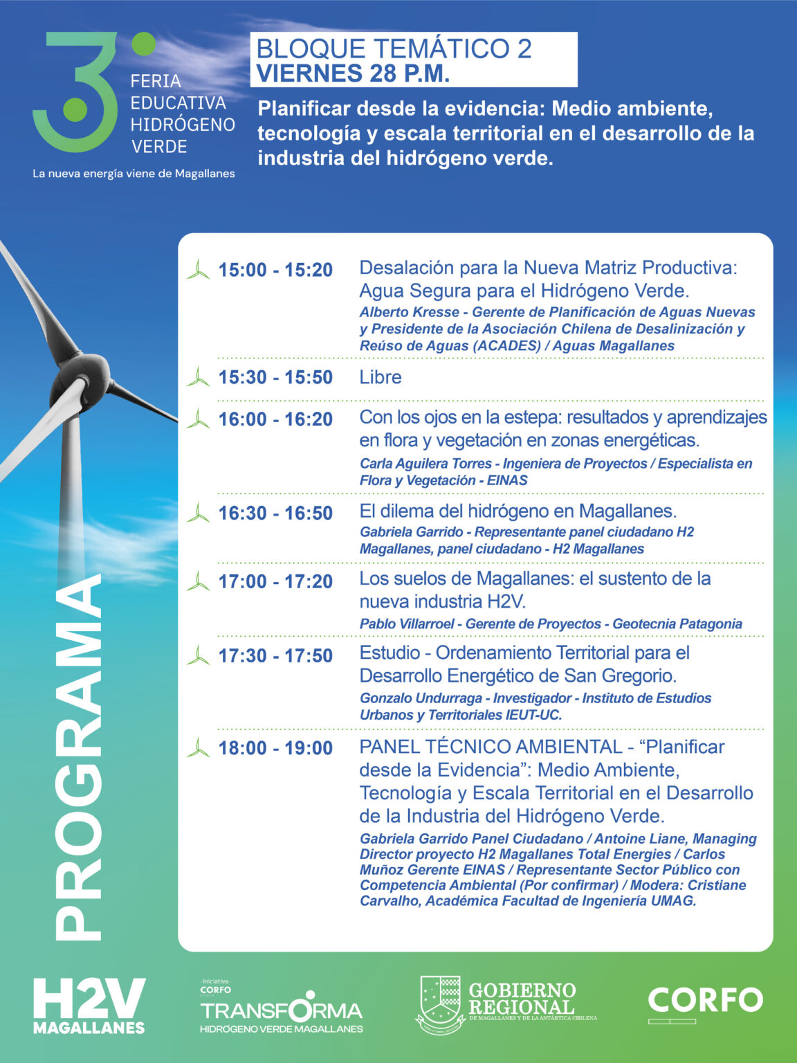 Luego, en el transcurso de la mañana, se abordará en diversos paneles los avances globales y locales del hidrógeno verde; la industria del amoníaco; la evaluación de Haru Oni (la primera planta operativa de e-combustibles del mundo), a tres años de su funcionamiento; también el uso del agua en la producción de hidrógeno verde; el estudio de ordenamiento territorial para San Gregorio; y por cierto, participación de la ciudadanía, por medio del Panel Ciudadano H2.
