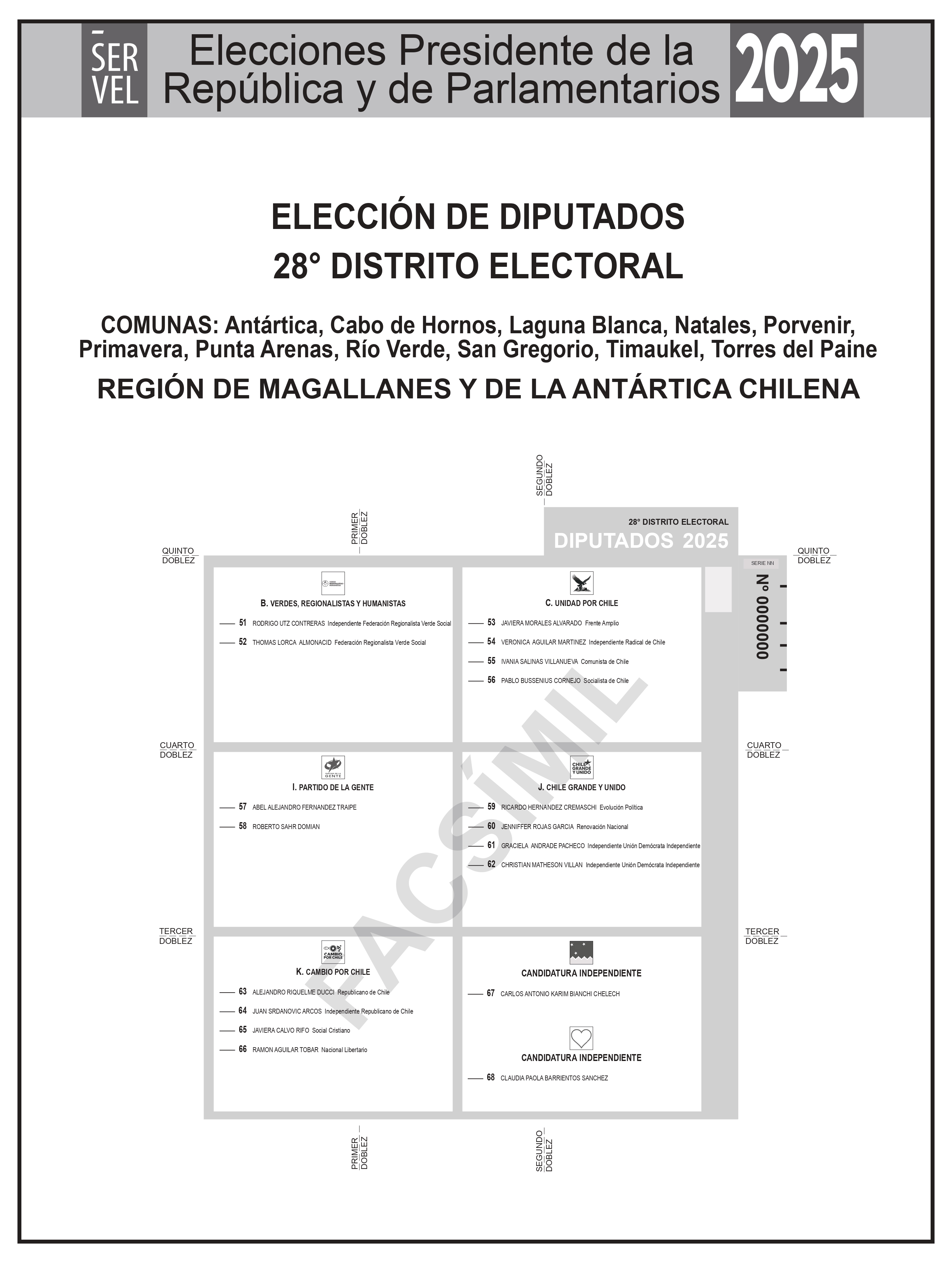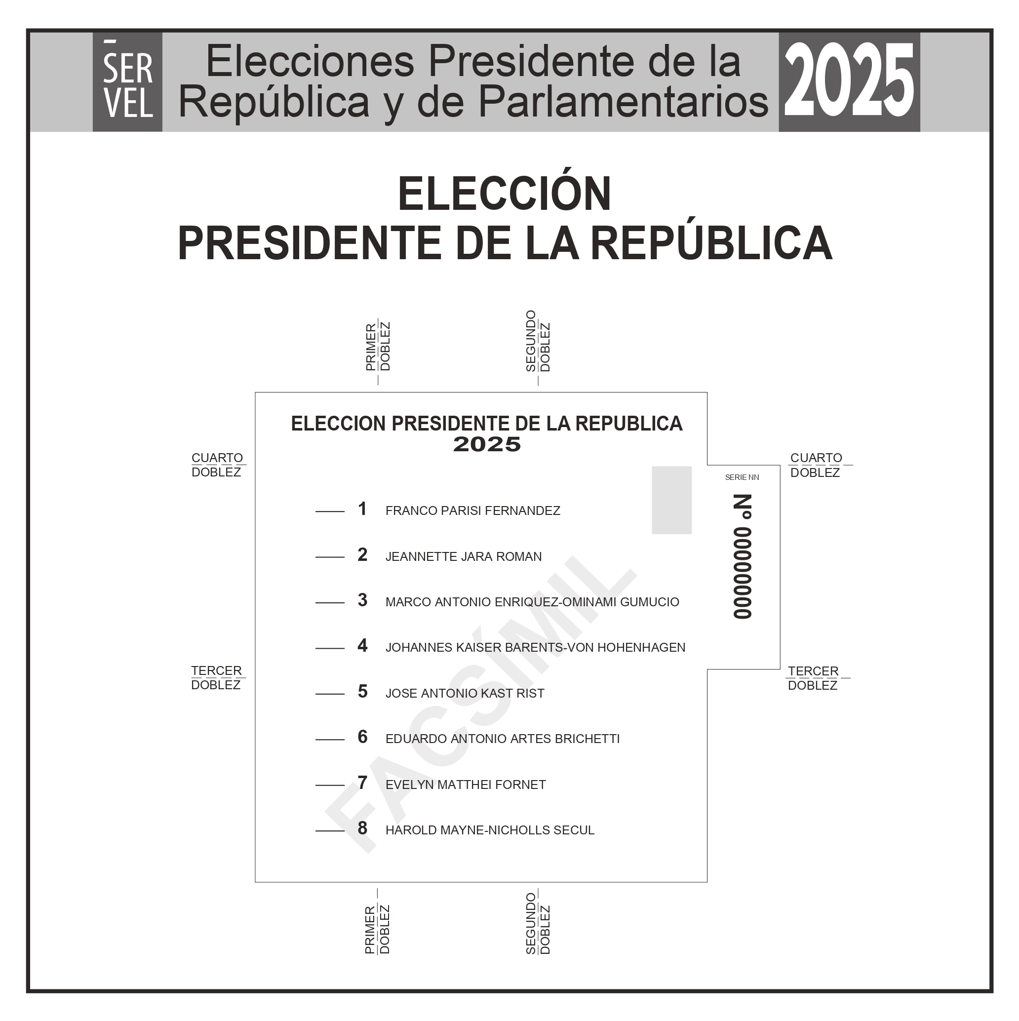 El Servicio Electoral (Servel) ha puesto a disposición de la ciudadanía un sitio web especializado con los facsímiles oficiales de las cédulas de votación para las Elecciones Presidencial y Parlamentarias 2025. Estos documentos se encuentran organizados por región y comuna.
