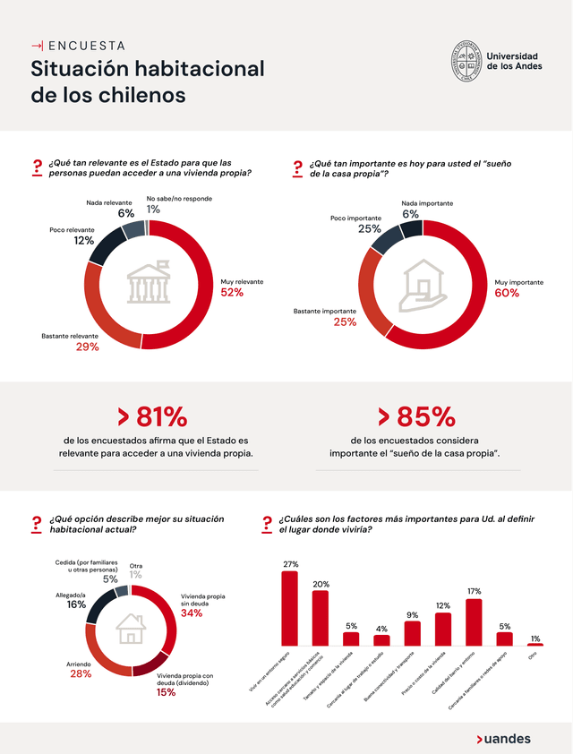 Pese a las dificultades, el "sueño de la casa propia" es considerado como muy importante y bastante importante por el 85% de las personas. Sin embargo, el contexto del mercado dificulta las cosas, por lo que para el 81% el rol del Estado es clave para acceder a la vivienda propia.