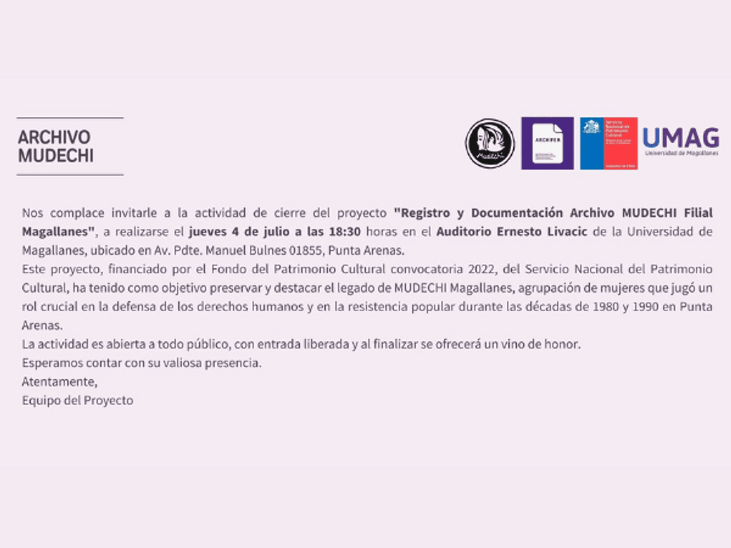 Este jueves 4 de julio se realizara la Actividad cierre del proyecto "Registro y documentación archivo Mudechi filial Magallanes" en el auditorio Ernesto Livacic de la Universidad de Magallanes, Av. Pdte. Manuel Bulnes 01855, Punta Arenas.