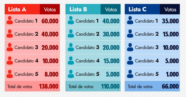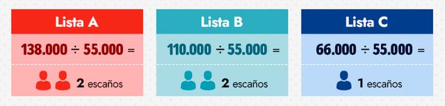 ¿Cómo se calculan los ganadores? Tomaremos como ejemplo un distrito electoral que elige 5 diputados, donde votan 314.000 personas y existen tres listas participando.