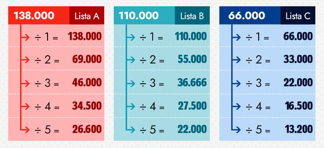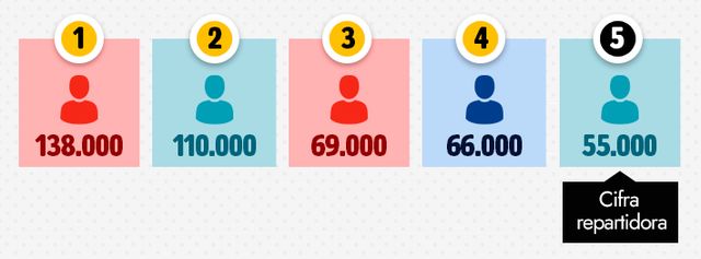 Se divide la cantidad de votos obtenidos por cada lista por uno y hasta el número de escaños en competencia. En este caso, las divisiones son por 1, 2, 3, 4 y 5 (el número de escaños a elegir).