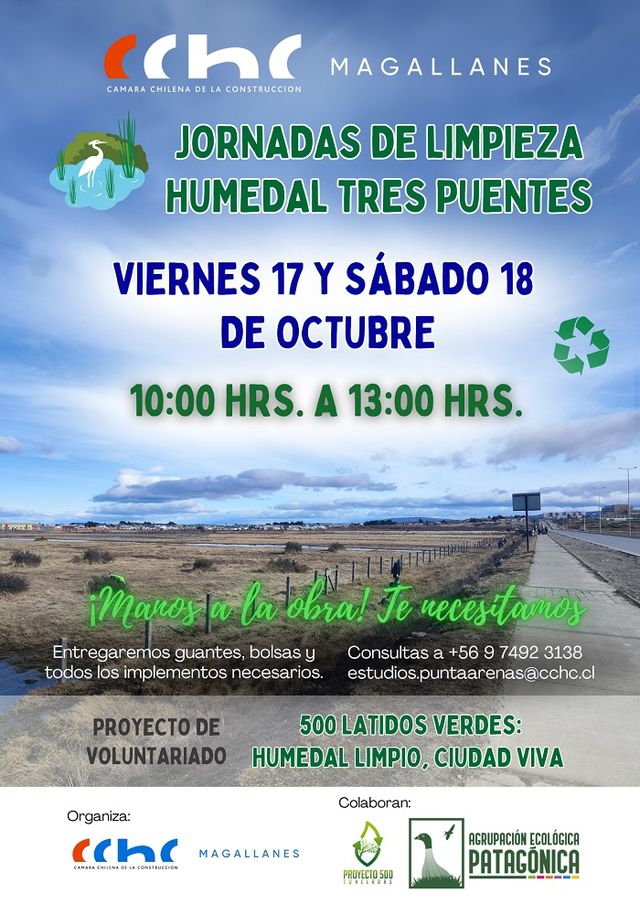La Cámara Chilena de la Construcción (CChC) Magallanes, junto al proyecto 500 Magallanes y la Agrupación Ecológica Patagónica (AEP), invitan a toda la comunidad a ser parte del voluntariado ambiental "500 Latidos Verdes: Humedal Limpio, Ciudad Viva", una actividad que consiste en dos jornadas de limpieza el viernes 17 de octubre y el sábado 18 de octubre, desde las 10:00 a las 13:00 hrs.