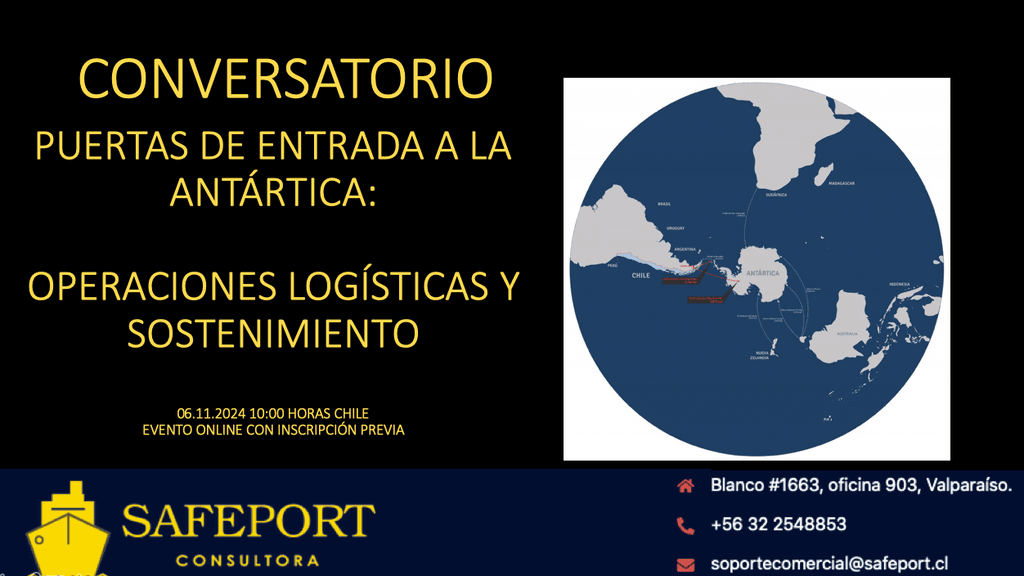 Este 6 de noviembre, vía online a partir de las 10:00 horas, se realizará el conversatorio "Puertas de entrada a la Antártica: Operaciones Logísticas y Sostenimiento", iniciativa liderada por Safeport consultores con el objetivo de analizar desafíos y proyecciones de operaciones marítimas en el Continente Blanco.