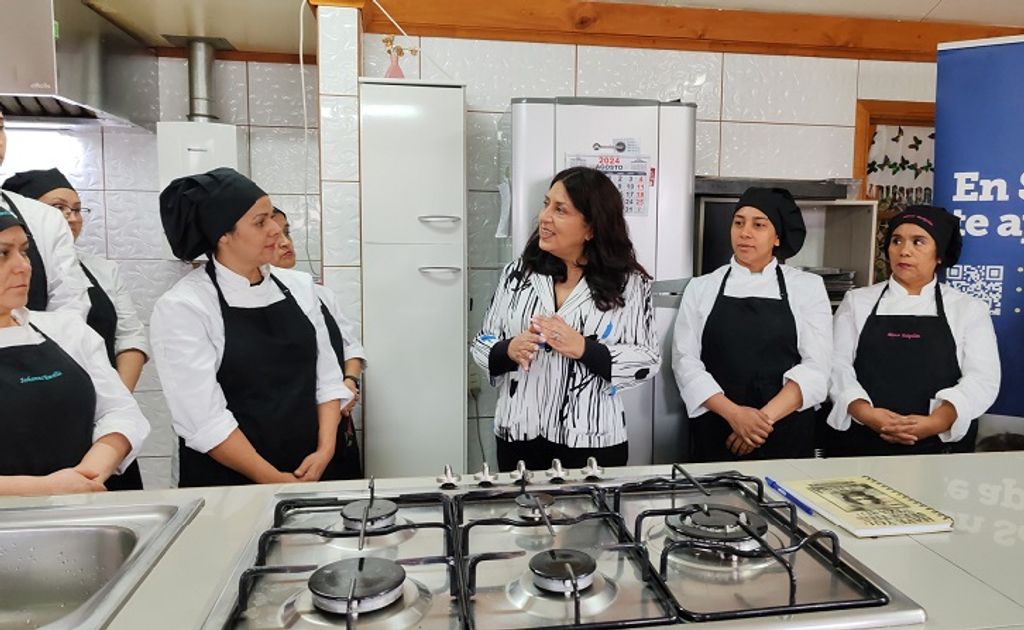 Así se desarrollaba el curso: Cocina Nacional e Internacional del programa Becas laborales, adjudicado por Sernameg, a través de los Fondos Concursables de Sence; al momento de la llegada de la delegada regional (s), Doris Sandoval; la seremi de la Mujer y Equidad de Género, Alejandra Ruiz; la directora de Sernameg, Pamela Leiva y la directora regional (s) de Sence, Doris Manquian Cuminao, quienes visitaron a las alumnas.