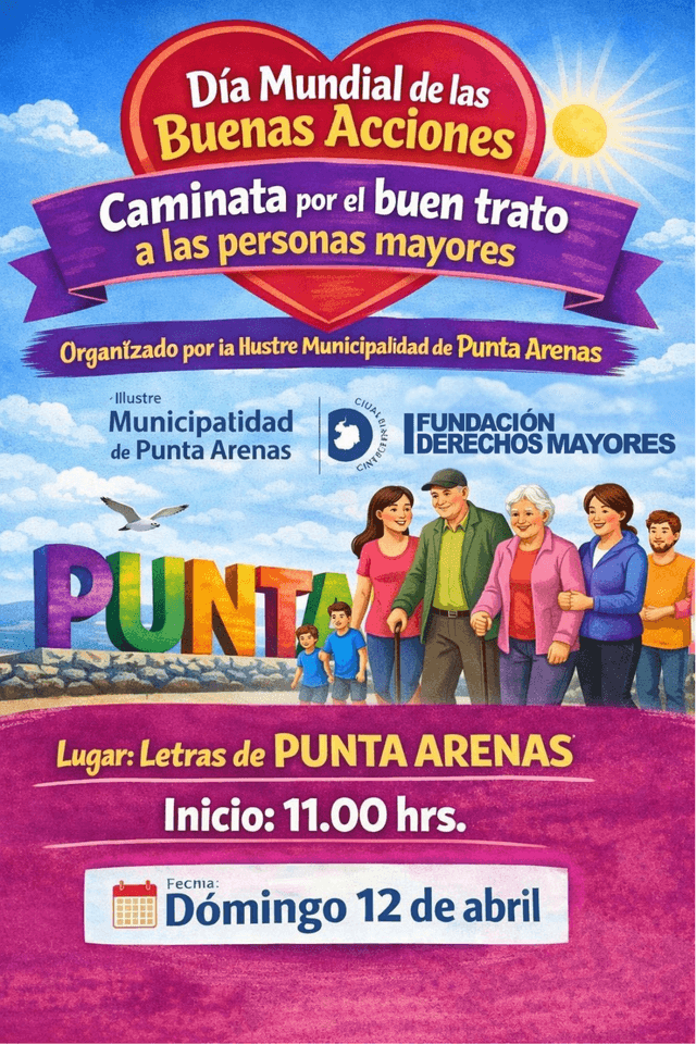 La Ilustre Municipalidad de Punta Arenas, junto a la Fundación Derechos Mayores, convocan a la comunidad a participar en la Caminata por el Buen Trato a las Personas Mayores, que se realizará este sábado 12 de abril a las 11:00 horas en las letras de Punta Arenas, en la costanera de la ciudad.