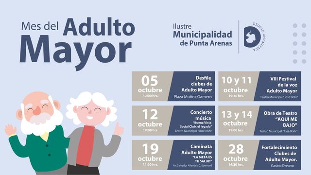 Las celebraciones comenzarán el domingo 5 de octubre a las 12:00 horas, con un desfile cívico en la Plaza Muñoz Gamero. La programación continuará con el VIII Festival de la Voz del Adulto Mayor, que se realizará el 10 y 11 de octubre a las 19:30 horas en el Teatro Municipal, con premios en dinero y presentaciones de destacados artistas nacionales. El sábado 12, a las 19:00 horas, el mismo escenario recibirá el concierto "Música de Antaño", a cargo de la agrupación "Buena Vista Social Club – El legado". Luego, los días 13 y 14, también a las 19:00 horas, se presentará la obra teatral "Aquí me bajo yo", protagonizada por Jaime Vadell, junto a Rodrigo Bastidas y Milena Bastidas. El domingo 19 a las 11:00 horas se realizará la caminata "La meta es tu salud", enfocada en la promoción del autocuidado. Finalmente, el martes 28 a las 14:30 horas, se cerrará el mes con un encuentro en el Casino Dreams, que reunirá a más de 200 dirigentes de clubes de adultos mayores.