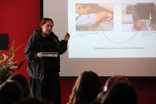 Desde la experiencia en el aula, Susana Hernández Rojas, Directora del Jardín Infantil Trébol, de Lo Barnechea, región Metropolitana, presentó la exposición "Arte e inclusión como territorios de encuentro en contextos públicos”. Compartió su práctica que busca alinear a "maestros y aprendices" para que todos accedan al conocimiento, viendo a los niños y niñas como maestros y no tan sólo como aprendices.