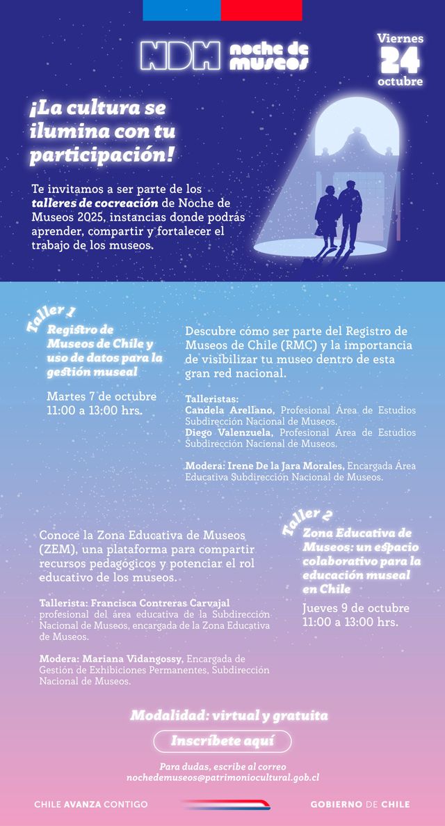 El director regional del Serpat, Pablo Quercia, informó que "la convocatoria es para el viernes 24 de octubre, por lo que invitamos a museos y salas de exposición museográficas a inscribirse en el sitio www.nochedemuseos.cl hasta el martes 21 de octubre. Además, los museos y salas de exposición museográficas inscritas podrán solicitar materiales gráficos de apoyo, voluntariado e intérprete en lengua de señas chilena hasta el 14 de octubre, y así fortalecer la visibilidad de sus actividades".