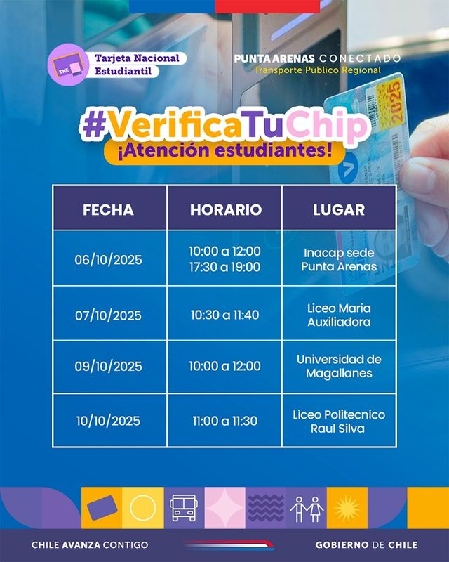 La campaña "Verifica tu Chip", busca que todos los estudiantes que utilizan el transporte público en Punta Arenas, tengan habilitadas sus TNE para el 1 de noviembre de 2025, fecha en que el sistema de pago electrónico "Punta Arenas Conectado", eliminará definitivamente el pago en efectivo en el transporte público, convirtiendo a la tarjeta estudiantil en el único medio de pago válido para alumnos de enseñanza escolar y superior.