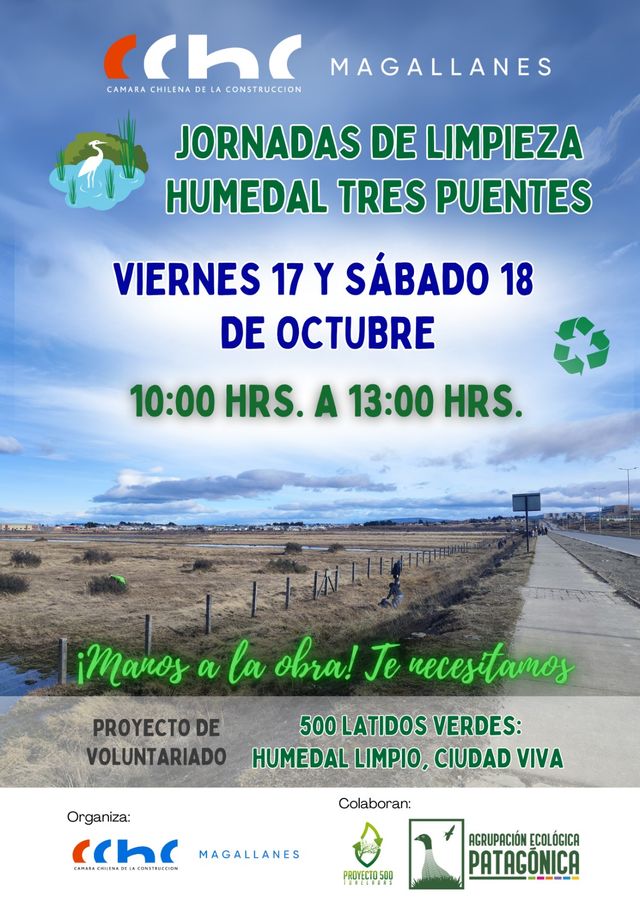Este viernes 17 y sábado 18 de octubre, entre las 10:00 y las 13:00 horas, se realizarán dos jornadas de limpieza en el Humedal Tres Puentes, iniciativa impulsada por la Cámara Chilena de la Construcción (CChC) Magallanes, en conjunto con el Proyecto 500 Magallanes y la Agrupación Ecológica Patagónica (AEP).